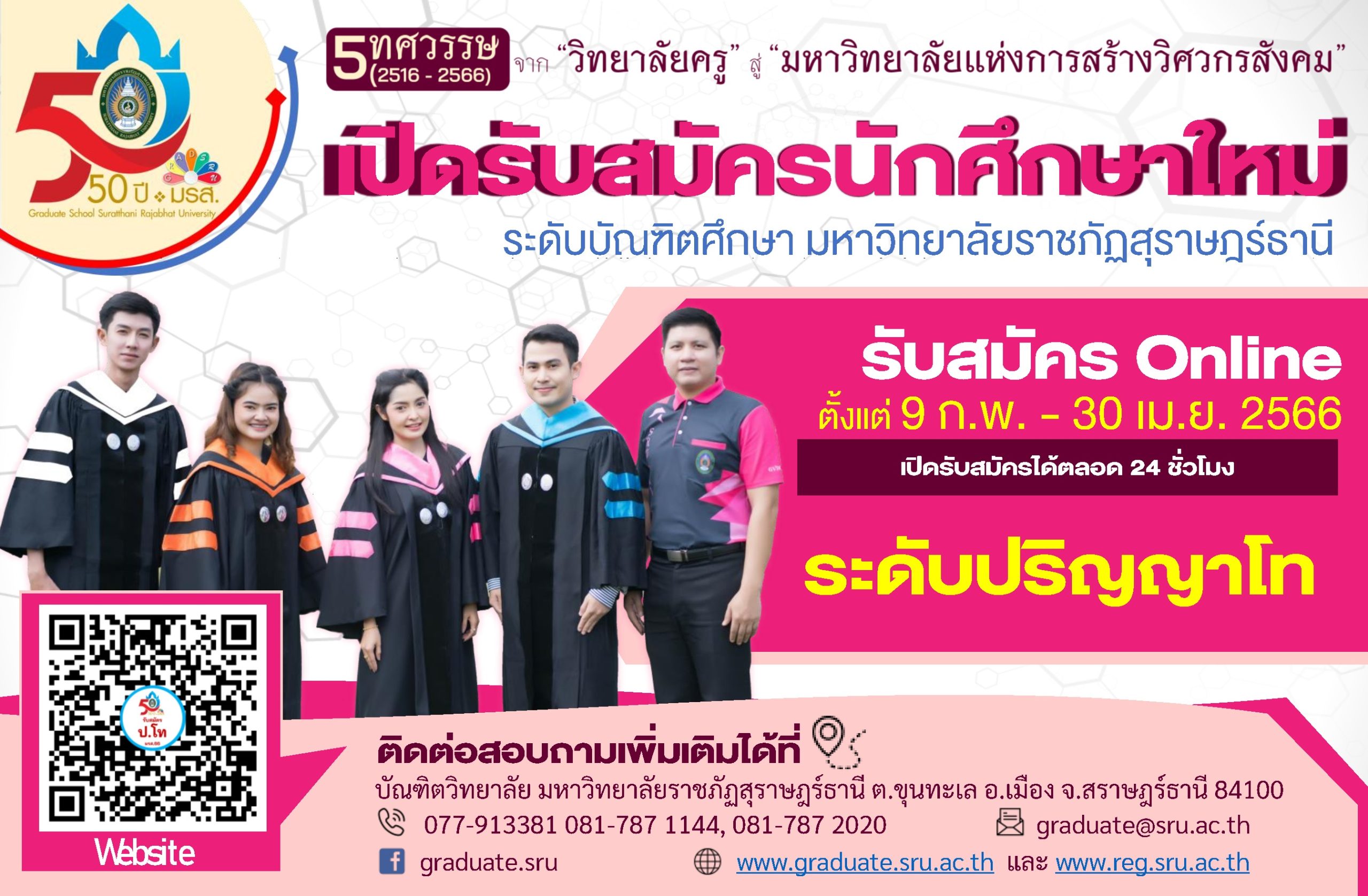 บัณฑิตวิทยาลัย มหาวิทยาลัยราชภัฏสุราษฎร์ธานี กำหนดเปิดรับสมัครนักศึกษาระดับปริญญาโท ประจำภาคเรียนที่ 1/2566 โดยวิธีการสมัครออนไลน์
