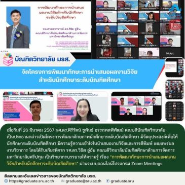 เมื่อวันที่ 25 มีนาคม 2567 ผศ.ดร.ศิริรัตน์ ชูพันธ์ อรรถพลพิพัฒน์ คณบดีบณฑิตวิทยาลัย เป็นประธานกล่าวเปิดโครงการพัฒนาศักยภาพนักศึกษาระดับบัณฑิตศึกษา มีวัตถุประสงค์เพื่อให้นักศึกษาระดับบัณฑิตศึกษา มีความรู้ความเข้าใจในนำเสนองานวิจัยและการตีพิมพ์เผยแพร่ผลงานวิชาการ โดยได้รับเกียรติจาก รศ. ดร.วิทวัส แจ้งเอี่ยม คณบดีบัณฑิตวิทยาลัย มหาวิทยาลัยบูรพา เป็นวิทยากรบรรยายให้ความรู้ เรื่อง “การพัฒนาทักษะการตีพิมพ์เผยแพร่ผลงานวิจัยสำหรับนักศึกษาระดับบัณฑิตศึกษา” ผ่านระบบออนไลน์โปรแกรม Zoom Meetings