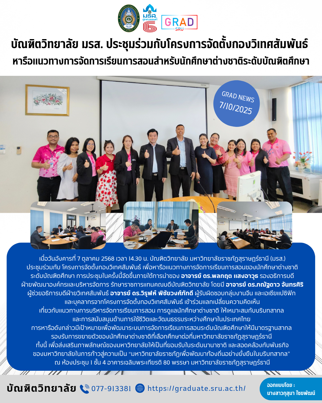 การหารือดังกล่าวมีเป้าหมายเพื่อพัฒนาระบบการจัดการเรียนการสอนระดับบัณฑิตศึกษาให้มีมาตรฐานสากล รองรับการขยายตัวของนักศึกษาต่างชาติที่เลือกศึกษาต่อที่มหาวิทยาลัยราชภัฏสุราษฎร์ธานี ทั้งนี้ เพื่อส่งเสริมภาพลักษณ์ของมหาวิทยาลัยให้เป็นที่ยอมรับในระดับนานาชาติ และสอดคล้องกับพันธกิจของมหาวิทยาลัยในการก้าวสู่ความเป็น “มหาวิทยาลัยราชภัฏเพื่อพัฒนาท้องถิ่นอย่างยั่งยืนในบริบทสากล” ณ ห้องประชุม 1 ชั้น 4 อาคารเฉลิมพระเกียรติ 80 พรรษา มหาวิทยาลัยราชภัฏสุราษฎร์ธานี